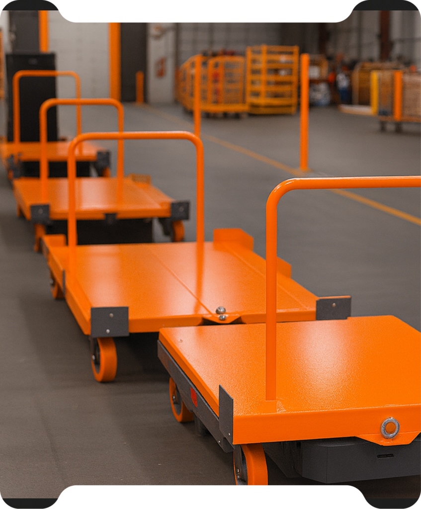 Rivian partnered with us to optimize material handling in their assembly plant. With our custom tugger carts and autonomous solutions, they reduced manual movements by 40% and improved line efficiency significantly.